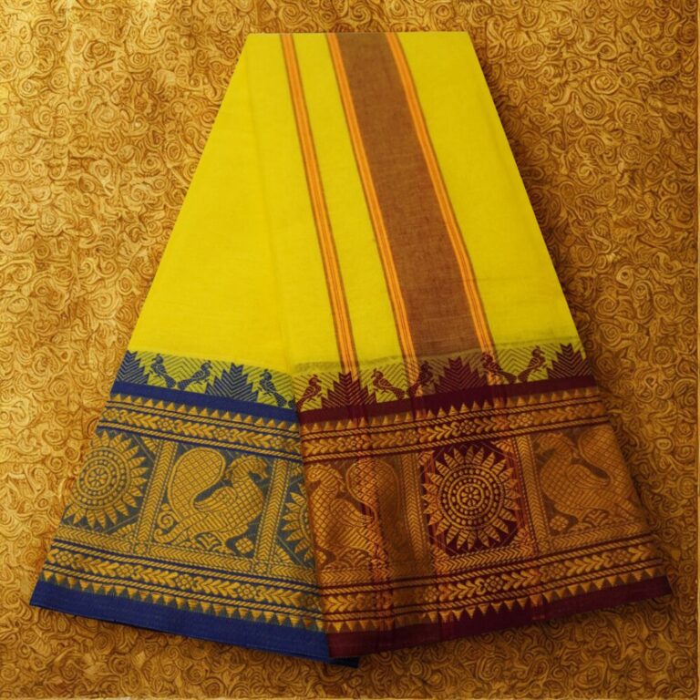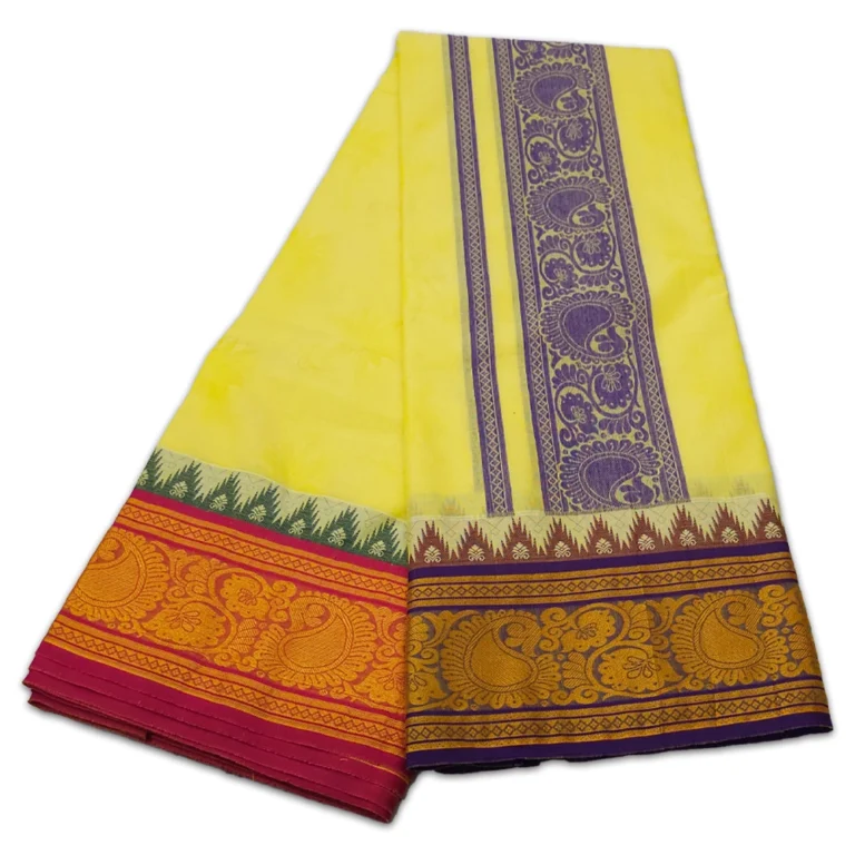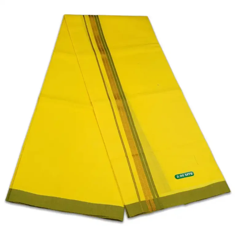 Note: Choose your item based upon the colour of the dhoti not by Border Design & Colour Combinations. The border Design and Colours are subject to availability. Do not place any order by mentioning specific Border design and Colours. Dhoti Colour: Yellow Cotton Size Description: