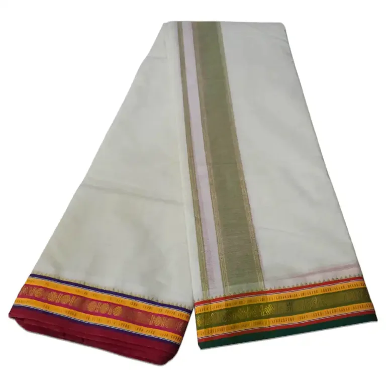 Dhoti Material: Pure cotton Color: Half White Border Size: 7 Inch Size Description: 9+5 – 4 Meter Dhoti + 2.25 Meter Towel 10 + 6 – 4.5 Meter Dhoti + 2.75 Meter Towel