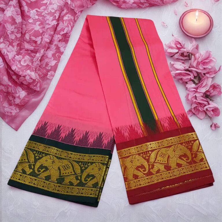 Coral Color Karishma Soft Silk 7 Inch Border Fine Quality Dhoti
