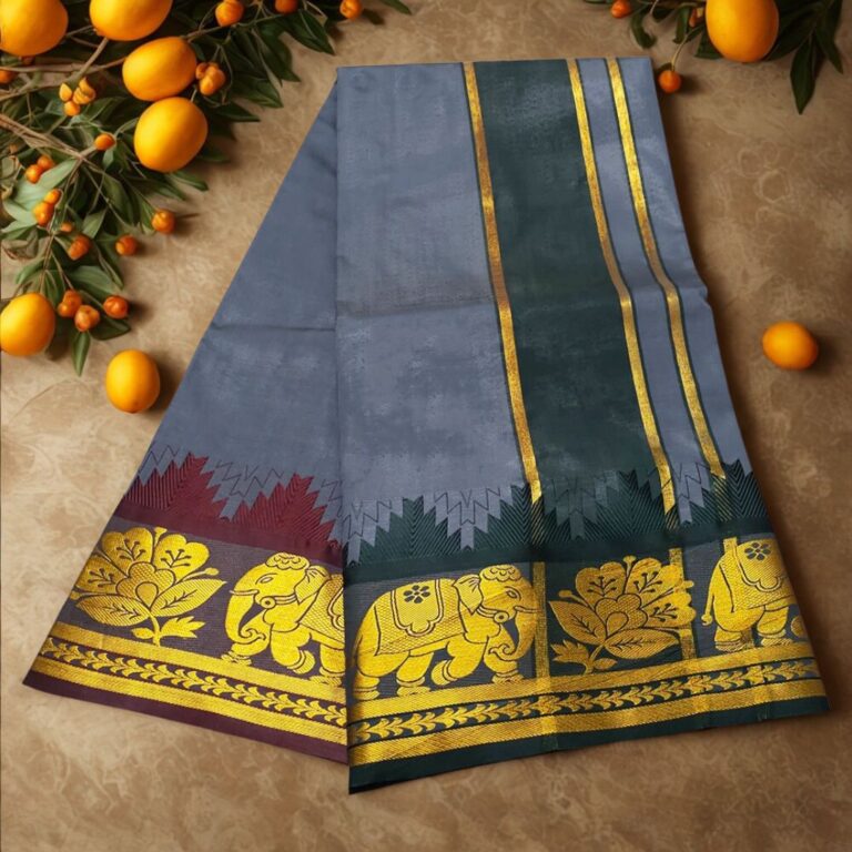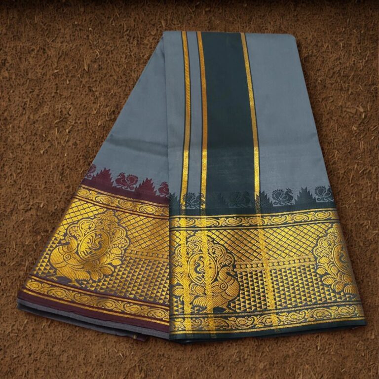Note: Choose your item based upon the colour of the dhoti not by Border Design. The border Designs are subject to availability. Do not place any order by mentioning specific Borders. Here the Product is Made up of fine quality of Silk Mix Materials in both warp and wept. Both Dhoti and Towel attached together with running Material. The customer needs to be cut the Dhoti and towel from their end, or else please inform to our customer care immediately through whatsapp or Voice call, so that our team will cut the dhoti towel separately before dispatching the Material. Border Size: ~9 Inches Dhoti Colour: Grey Colour Karishma (Silk Mix) Size Description: