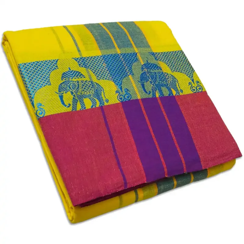 Vimayam Cotton Colour Gudanji Dhoti is having 4 Meter of Dhoti and 2.25 Meter of Towel. Both Dhoti and Towel attached together with running Material. The customer needs to be cut the Dhoti and towel from their end, or else please inform to our customer care immediately through whatsapp or Voice call, so that our team will cut the dhoti towel separately before dispatching the Material.