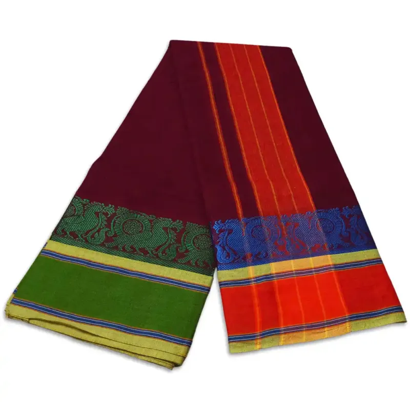 Dhoti Material: Pure Cotton Maroon Colour Dhoti Dhoti Size: 9x5 Vimayam Cotton Colour Gudanji Dhoti is having 4 Meter of Dhoti and 2.25 Meter of Towel. Both Dhoti and Towel attached together with running Material. The customer needs to be cut the Dhoti and towel from their end, or else please inform to our customer care immediately through whatsapp or Voice call, so that our team will cut the dhoti towel separately before dispatching the Material.Orange Colour Dhoti 2 Inch Gundanji Fine Quality
