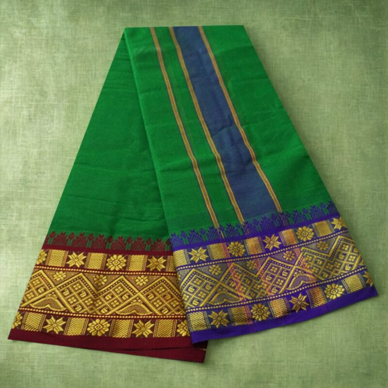 Material: Green Colour Dhoti Border Size: ~8 Inches Size: 9×5 Vimayam Cotton Colour Dhoti is having 4 Meter of Dhoti and 2.25 Meter of Towel. Both Dhoti and Towel attached together with running Material. The customer needs to be cut the Dhoti and towel from their end, or else please inform to our customer care immediately through whatsapp or Voice call, so that our team will cut the dhoti towel separately before dispatching the Material.Green Cotton Colour Fine Quality Dhoti 5 Inch Border