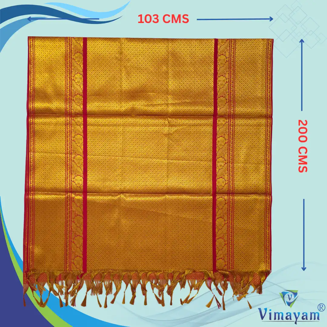 This shawl or malai is perfect to offer to temple priests, gurus, elders, or as a gift to the gods. Its elaborate zari border and sparkling art silk texture capture the richness of our spiritual heritage.
