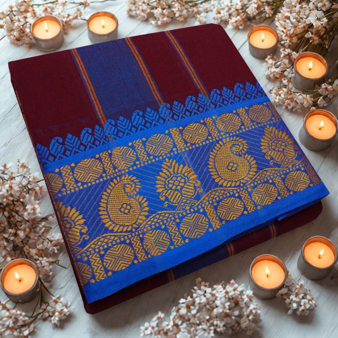 Be the first to review “Maroon Cotton Colour Fine Quality Dhoti 5 Inch Border”