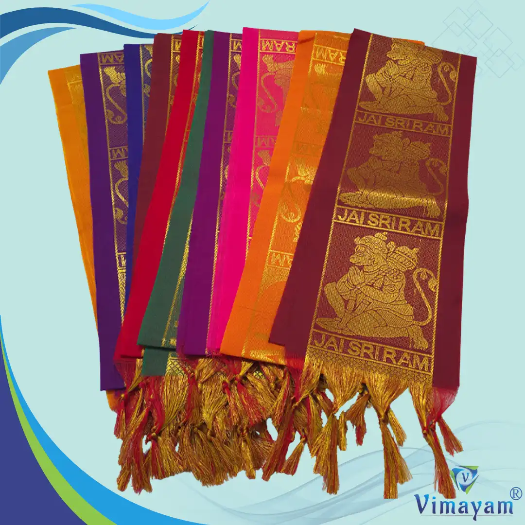 This shawl or malai is perfect to offer to temple priests, gurus, elders, or as a gift to the gods. Its elaborate zari border and sparkling art silk texture capture the richness of our spiritual heritage.