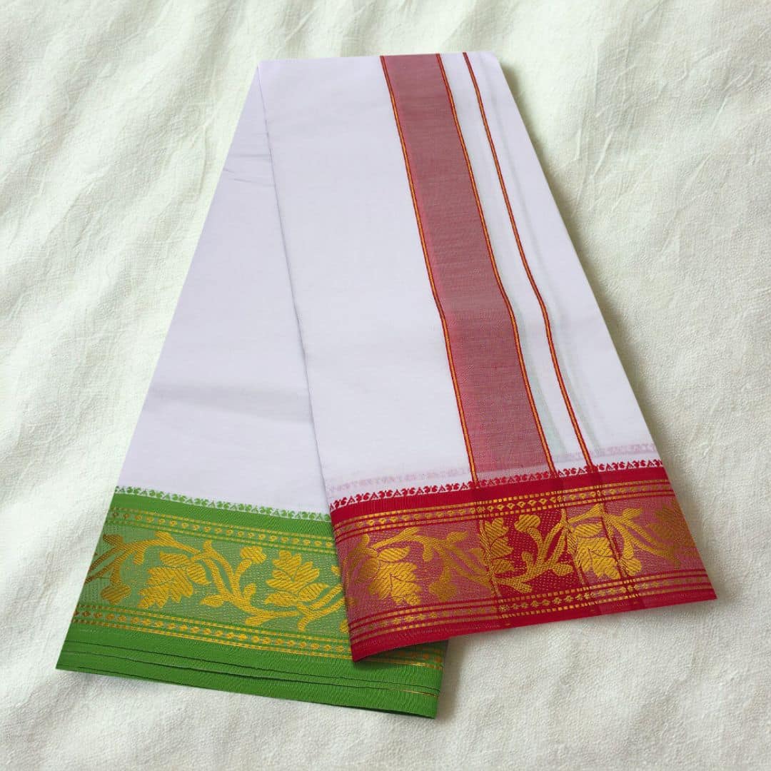 The primary colour of the border is Red and other side border will be varied based on production. Please choose your dhoti only by Red Colour not by both colour Combination