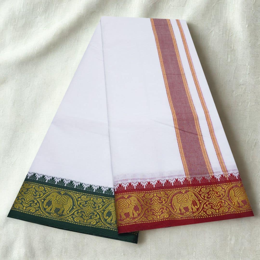 The primary colour of the border is Red and other side border will be varied based on production. Please choose your dhoti only by Red Colour not by both colour Combination